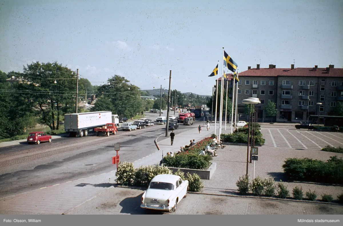 Vy från Folkets hus söderut, okänt årtal. Bilar kör vänstertrafik på Göteborgsvägen. Blomsterplanteringar och hissade svenska flaggor ses på Stadshusplatsen. I bakgrunden till höger ligger lägenheter utmed Tempelgatan.