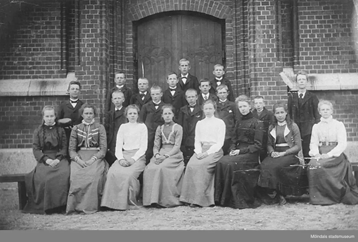 Konfirmationskort taget utanför kyrkporten till Fässbergs kyrka omkring 1905. Oskar Andersson står som fjärde person i mittenraden.