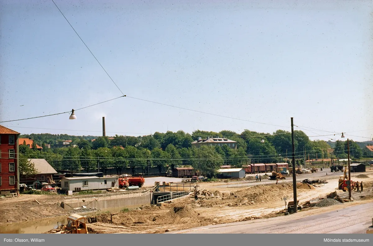 Vy från Folkets hus mot ost, okänt årtal. Till vänster skymtas Svalövsbolaget (röd byggnad). Mark schaktas mellan Göteborgsvägen och Mölndals järnvägsstation för nybyggnad av motorvägen E6/E20. Huset i bildens mitt byggdes under 1930-talet och kallades för "Mölndals skyskrapa", Kvarnbygatan 1 (numera Nämndemansgatan 1).