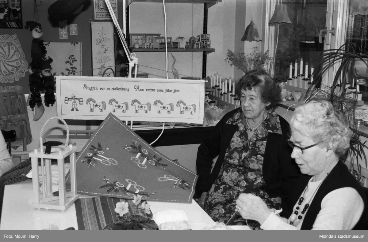 Aktiviteter för äldre på Våmmedalsvägens dagcentral i Kållered, år 1984. "Maja Brattberg och Valborg Nilsson med julsaker i Vommedal."