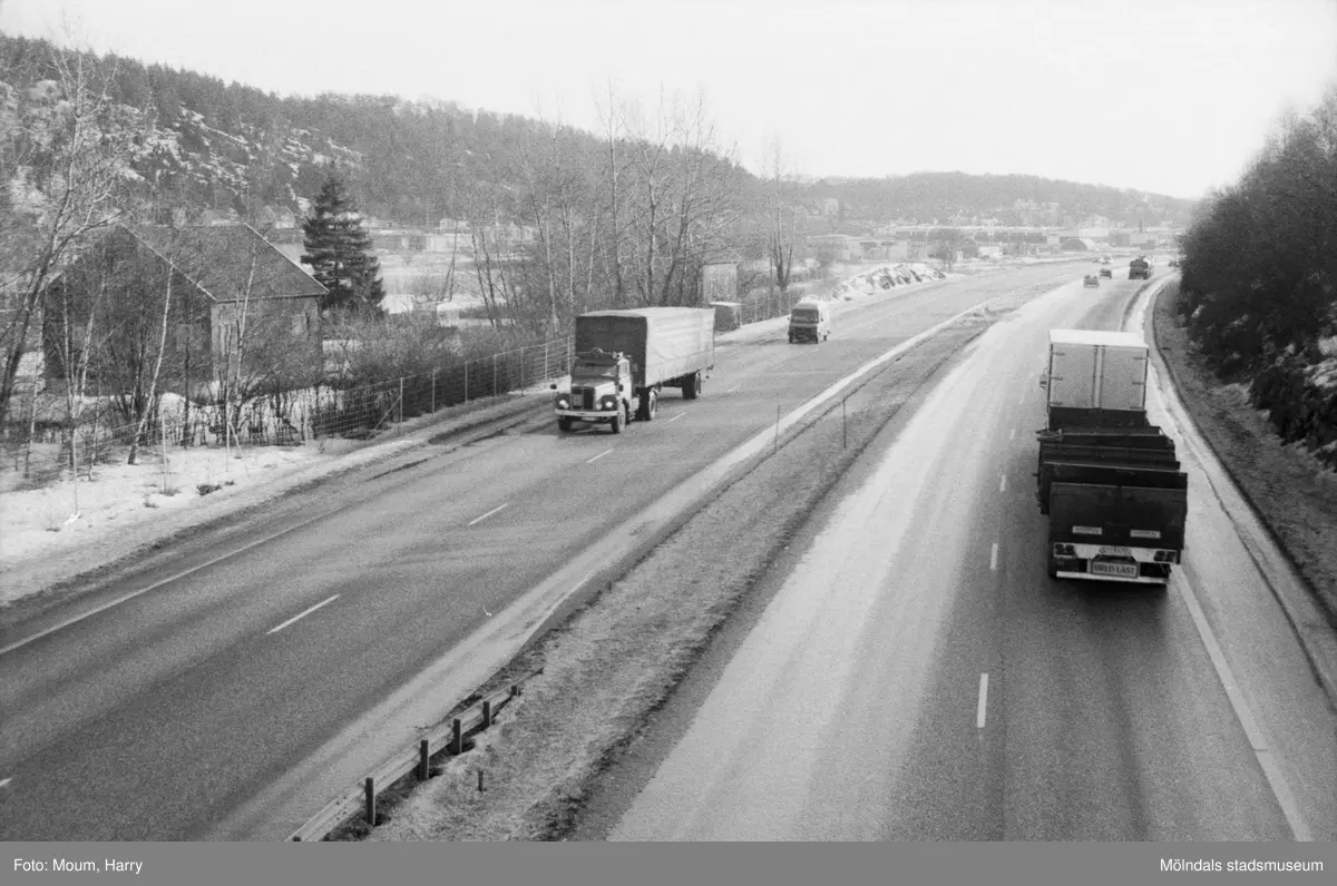 Problem med buller vid motorvägen i Kållered, år 1985. "35.000 fordon per dygn passerar de utsatta fastigheterna i Kållered.