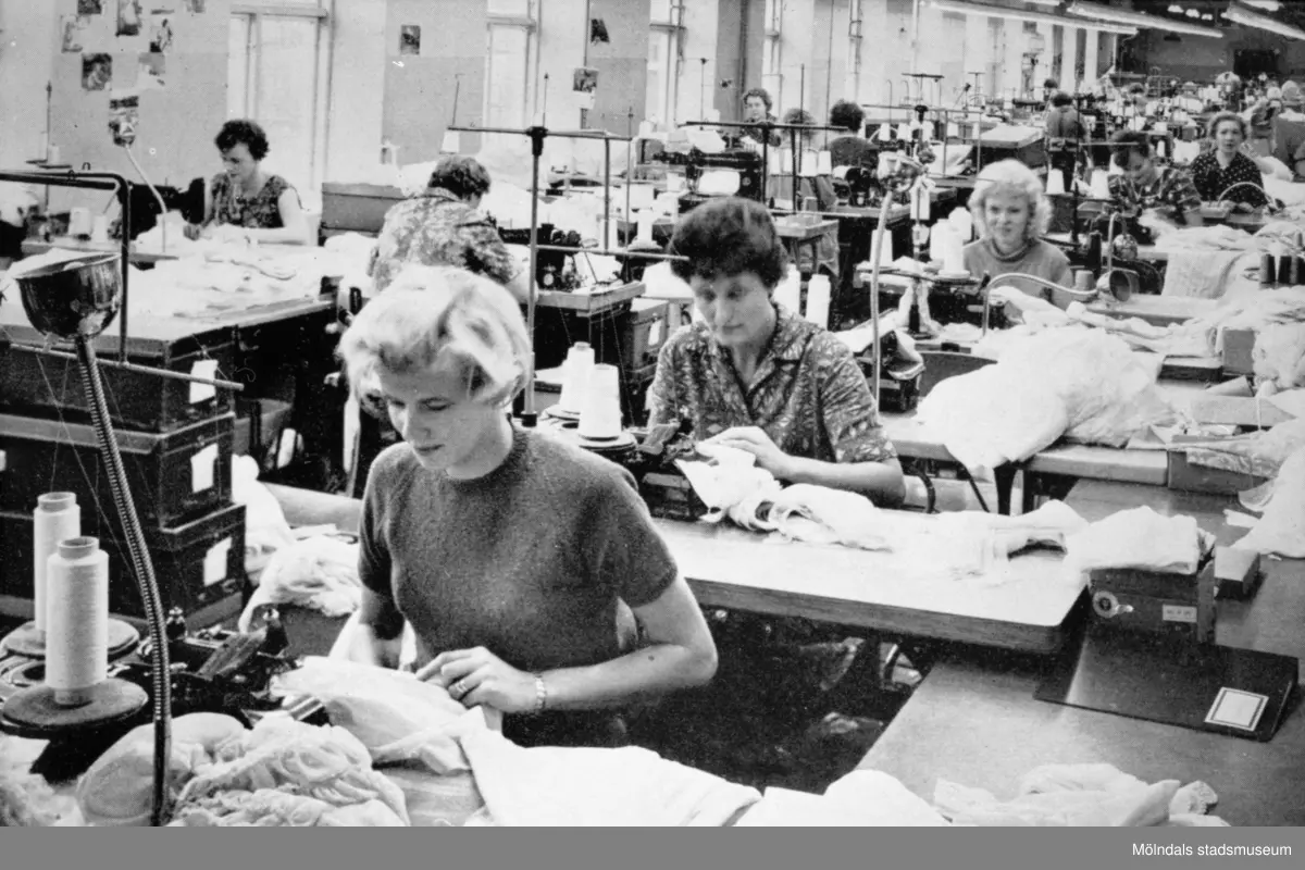 Sömmerskor arbetar i sömnadssalen på fabriken Eiser, 1950. Eiser ingick i bolaget Sveriges Förenade Trikåfabriker Avd. G. Kallades Stora Götafors i folkmun.