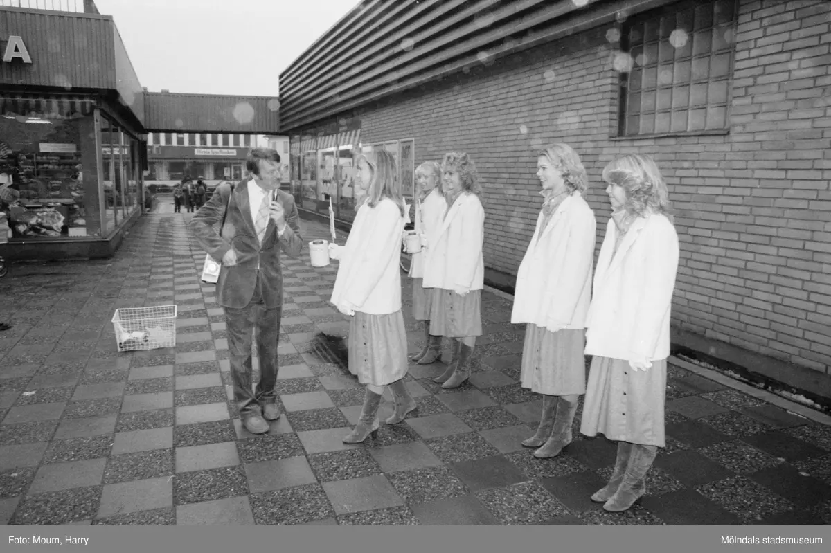 Olle "Smen" Svensson presenterar Kållereds lucia-kandidater i Kållereds centrum, år 1983.