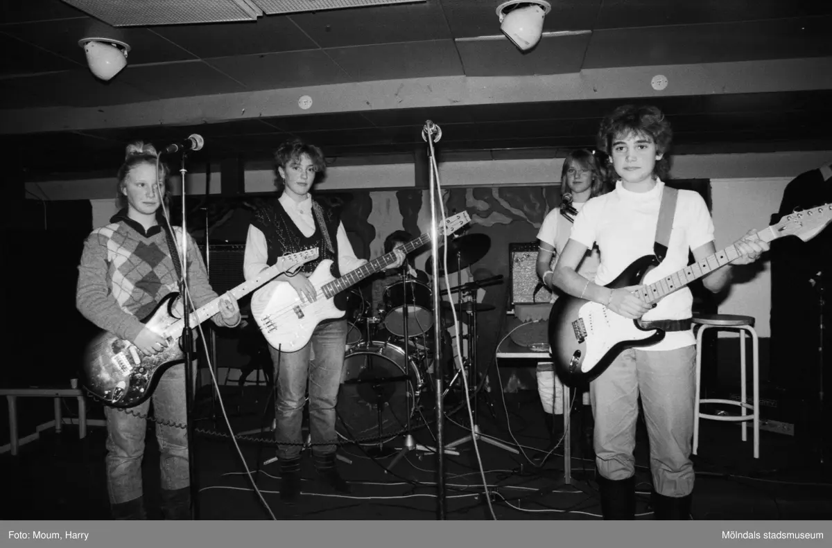 Popband repar i lokal i Kållereds centrum, år 1983. "Mixed Notes, Ulrika Lepik, Camilla Alenäs, Helena Rosenberg, Carin Jansson vid trummorna Maria Dahl."