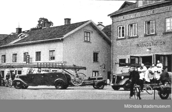 Brandkåren (Viktualieföreningens affär) vid Kvarnbygatan (idag: Gamla torget 41), 1930-tal. Avfotograferad ur "Mölndal 1922 - 1947".