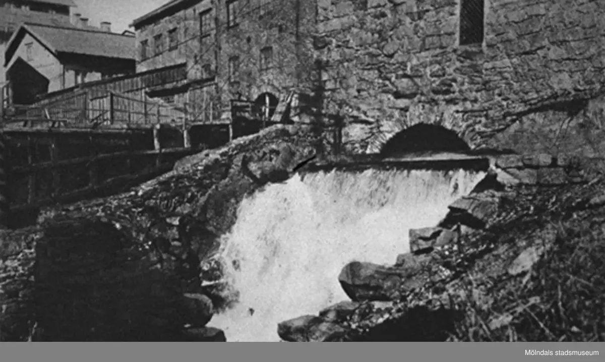 Västra och nedersta delen av Carlsbergs bomullsspinneri (Kvarnfallet 18 på Götaforsliden 17), innan 1942. I bakgrunden till vänster ses Örns kvarn eller Hulelycke kvarn (Kvarnfallet 13 på Kvarnbygatan).