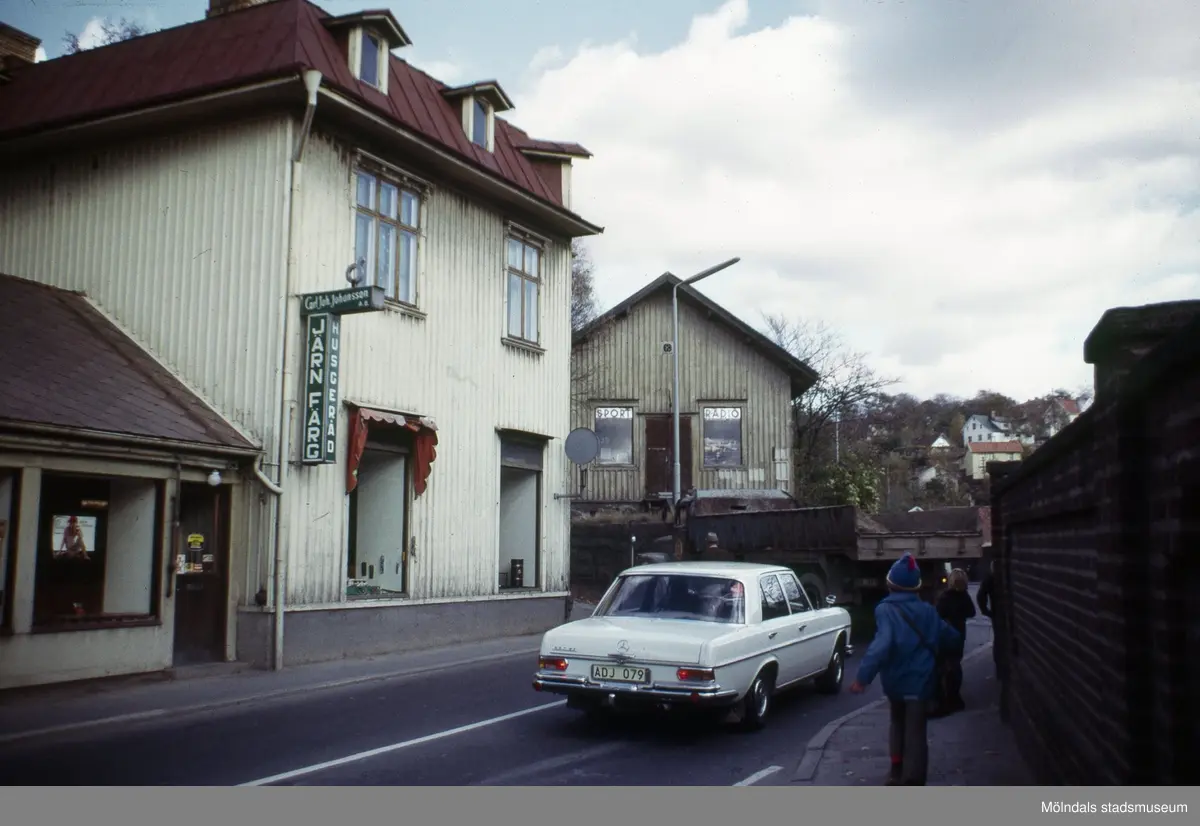 Kvarnbygatan 27 och 29 i Mölndals Kvarnby på 1970-talet. I nr 27 låg C.J. Johanssons Järnhandel. Nr 29 var Mölndals första stadshus. En rådstuga som med tiden blev affär för radio och sport.