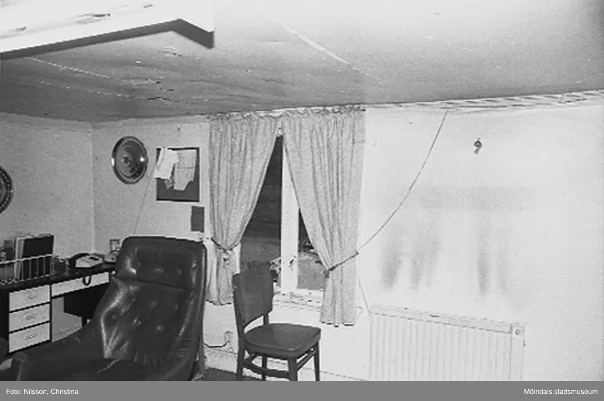 Kvarnfallet 31, röda huset, G-3, hösten 1994. Interiör från ett rum. Övergången mellan vägg och tak är något välvd. Fönstret som vetter mot väster har hela glas och en mittpost. Innertaket är av masonit och i dåligt skick med hål på flera ställen.