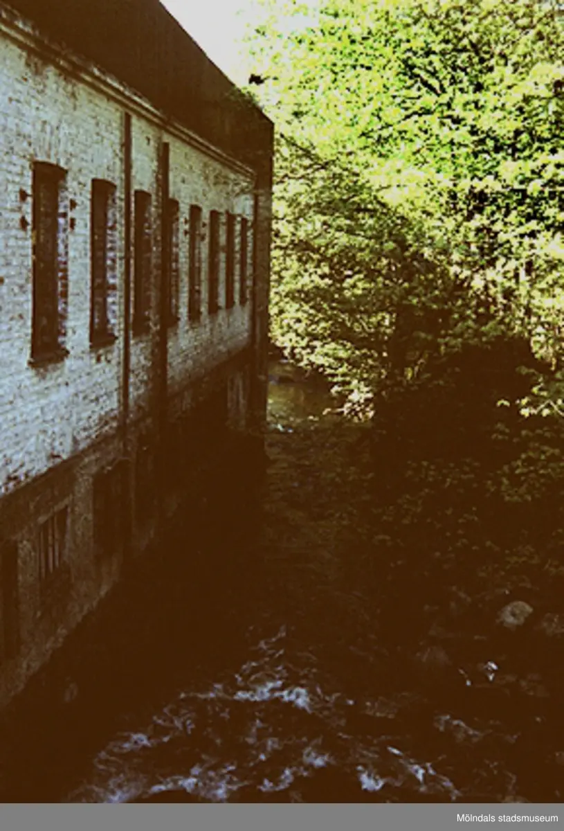 Till vänster ses fabriksbyggnad tillhörande före detta spinneriet Bettyholm/Carlsfors/Forsåkers fabriker "övre". Till höger om byggnaden rinner Kvarnforsen (Mölndalsfallen). Samrådsgruppen promenerar i "Övre Kvarnbyn" (Bettyholm mm) 1994-05-09. Relaterade motiv: 2003_0444 - 0455.
