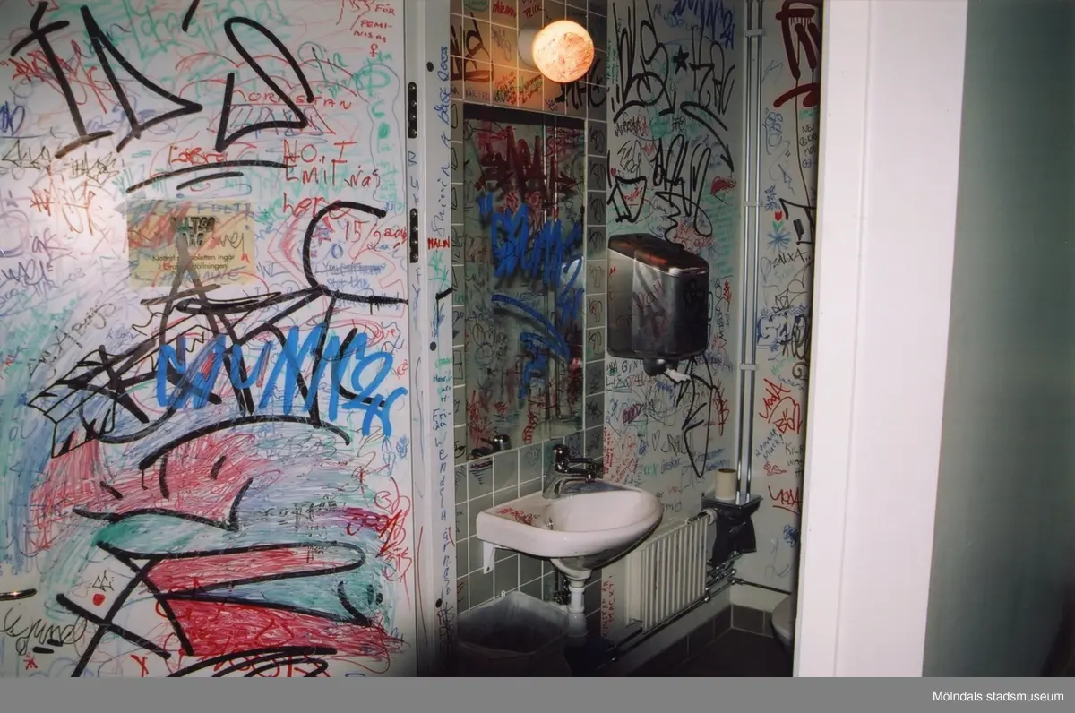 Graffitimålad toalett i samband med utställningen "Alltså finns jag" på Mölndals museum, år 2003. Museet hade lagt tuschpennor som besökarna fick använda till att rita på toaletternas inneväggar och dörrar. Efter utställningens slut återställdes de två toaletterna till ursprungligt skick.