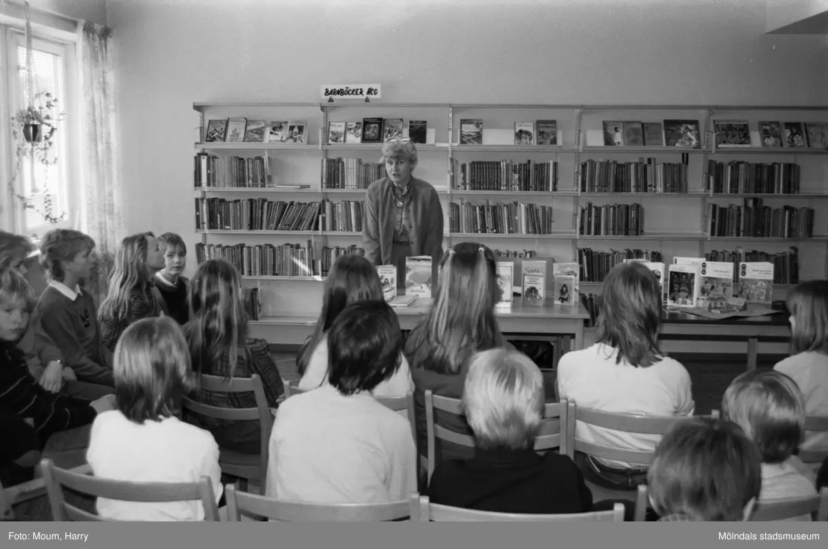 Författarinnan Maj Bylock besöker Kållereds bibliotek, år 1984.