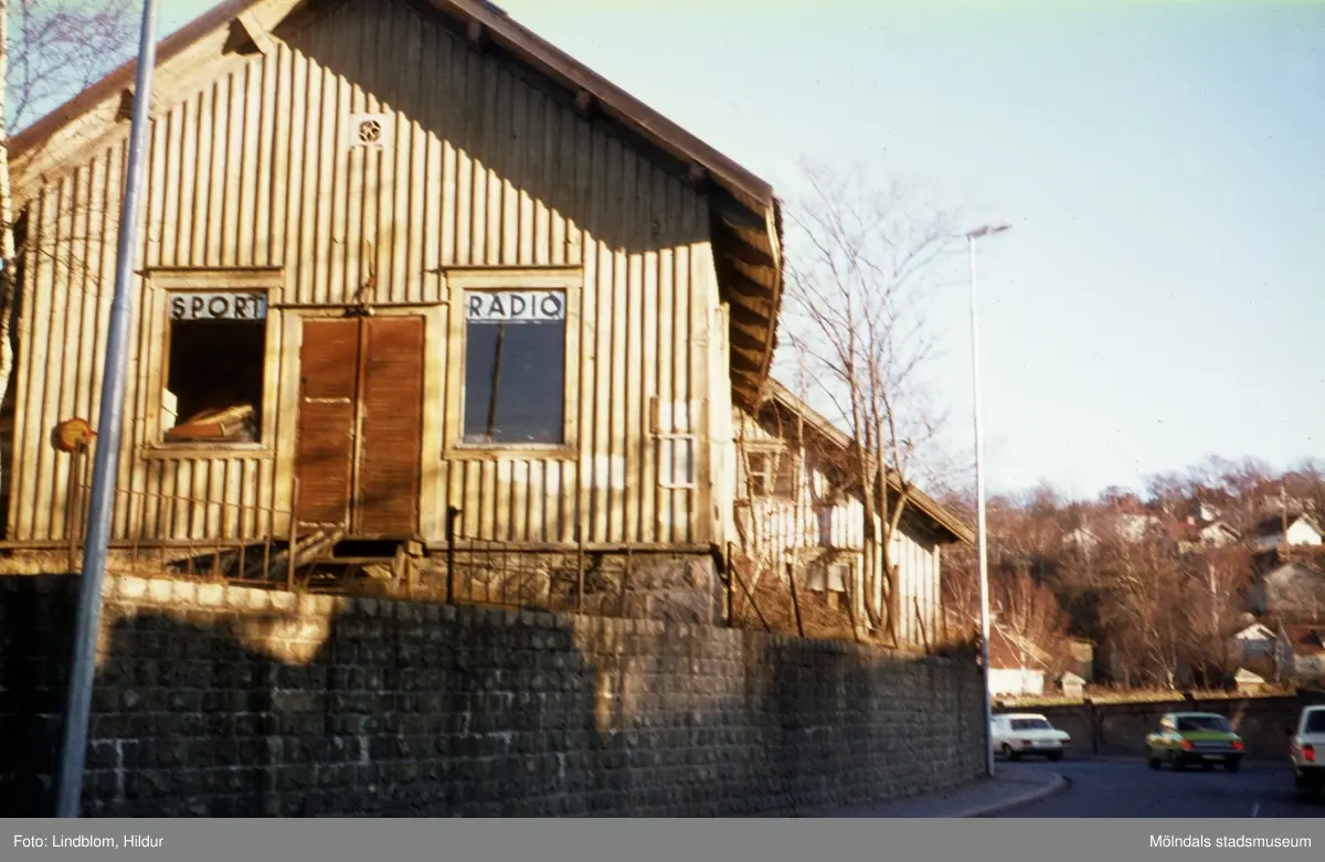 Kvarnbygatan 29, Mölndal gamla rådhus, rådstugan ("råsstu´n") i Mölndal, 1970-tal. Uppfört 1832, sedermera cykelaffär. Bakom huset ses även liten del av gaveln till huset Kvarnbygatan 31.