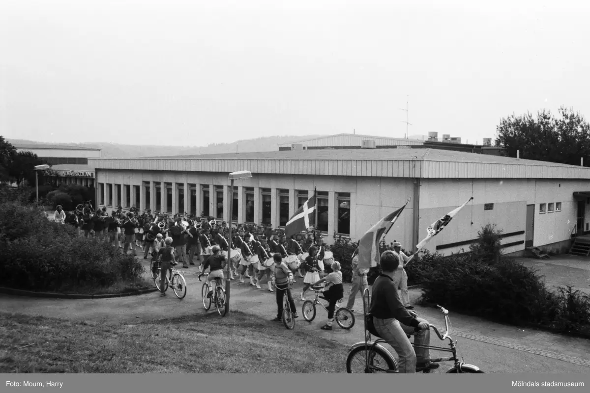 Danska orkestern Sæbygarden på marsch mot Lions traditionella loppmarknad i Lindome, år 1983. I bakgrunden ses Almåsskolans matsal.