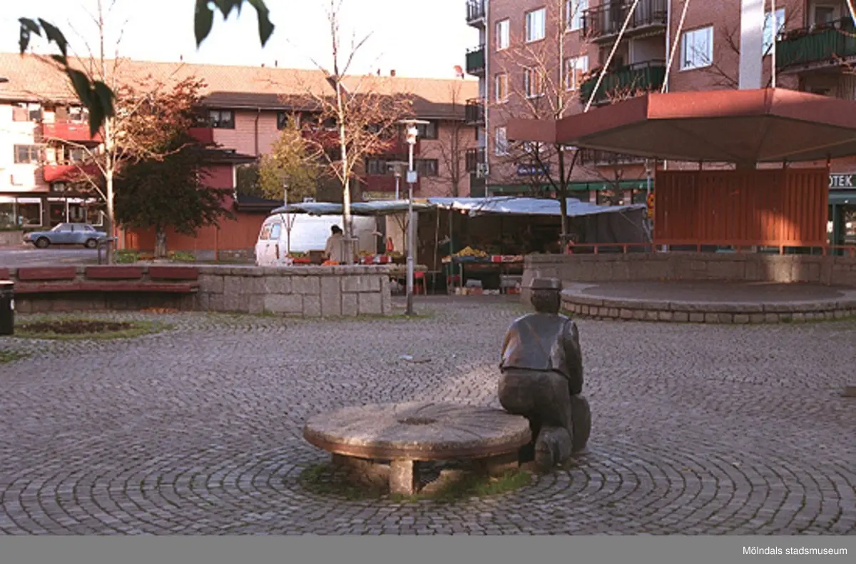 Skulpturen Albert, en scen och torghandel. Mölndalsbro i dag - ett skolpedagogiskt dokumentationsprojekt på Mölndals museum under oktober 1996. 1996_1098-1115 är gjorda av högstadieelever från Kvarnbyskolan 9C, grupp 5. Se även 1996_0913-0940, gruppbilder på klasserna 1996_1382-1405 samt bilder från den färdiga utställningen 1996_1358-1381.