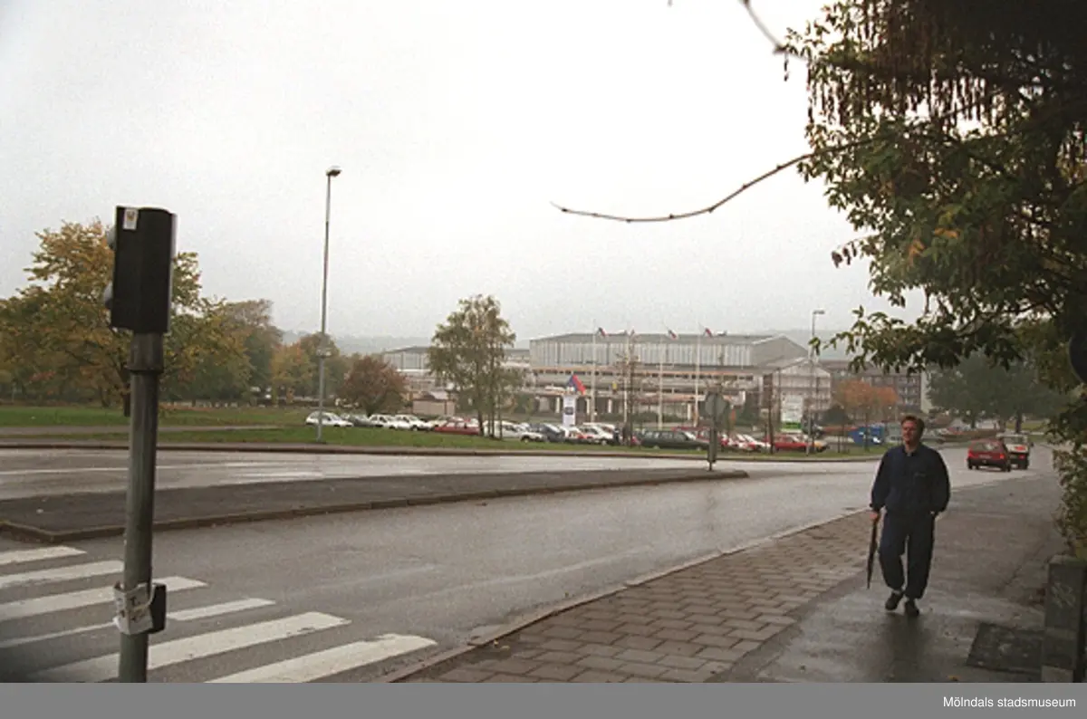 Idrottshuset/Aktivitetens baksida och parkering sedd från Frölundagatan/Toltorpsgatans rondell. Mölndalsbro i dag - ett skolpedagogiskt dokumentationsprojekt på Mölndals museum under oktober 1996. 1996_1153-1171 är gjorda av högstadieelever från Kvarnbyskolan 9D, grupp 2. Se även 1996_0913-0940.