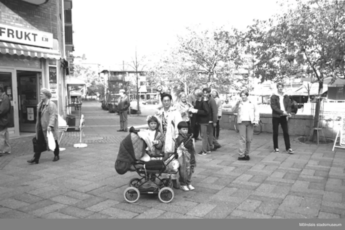 Familj som står framför Alberts torg. Till vänster skymtar Konfekthuset. Mölndalsbro i dag - ett skolpedagogiskt dokumentationsprojekt på Mölndals museum under oktober 1996. 1996_0991-1004 är gjorda av högstadieelever från Kvarnbyskolan 9A, grupp 5. Se även 1996_0913-0940, gruppbilder på klasserna 1996_1382-1405 samt bilder från den färdiga utställningen 1996_1358-1381.