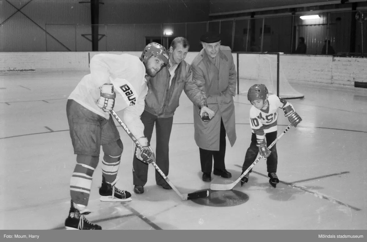 Invigning av Kållereds ishall, år 1984. "Första nedsläppet! Göran Larsson (äldst) och Johan Frisack (yngst) fick "teka" när Fritidsnämndens ordförande Lennart Johansson och fritidschef Thure Larsson släppte trissan."