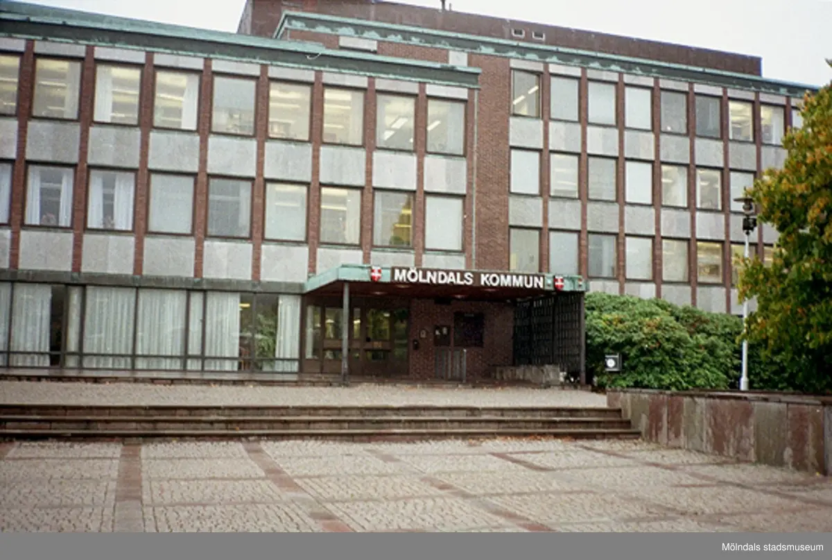 Mölndals stadshus sett från Stadshusplatsen. Mölndalsbro i dag - ett skolpedagogiskt dokumentationsprojekt på Mölndals museum under oktober 1996. 1996_1227-1245 är gjorda av högstadieelever från Kvarnbyskolan 9D, grupp 6. Se även 1996_0913-0940.