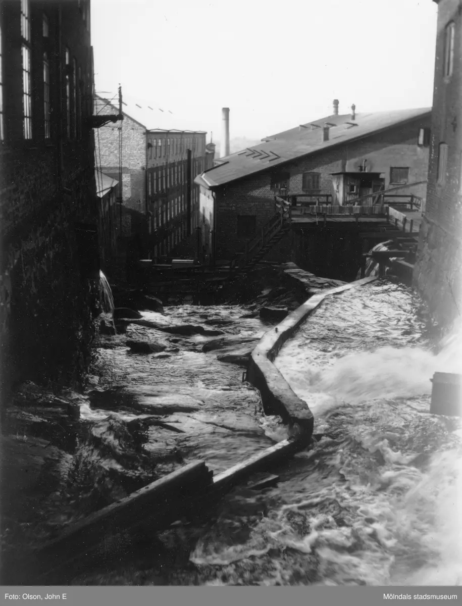 Översta delen av kvarnrännan i Mölndalsfallet, år 1899. Del av fem bilder i s/v för Mölndals kvarnby och industrierna. Relaterade motiv: 1992_0476 - 0479.