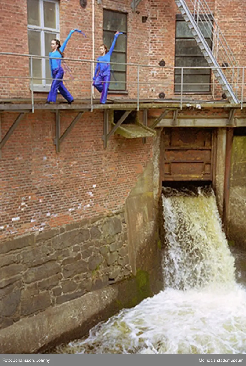 Titel: Kvarnbydagen 28 april 2002. Danstillställningen ForsAnde vid forsen och Oljeslageriet. Dansare: Tina Andersson och Åsa Thegerström.