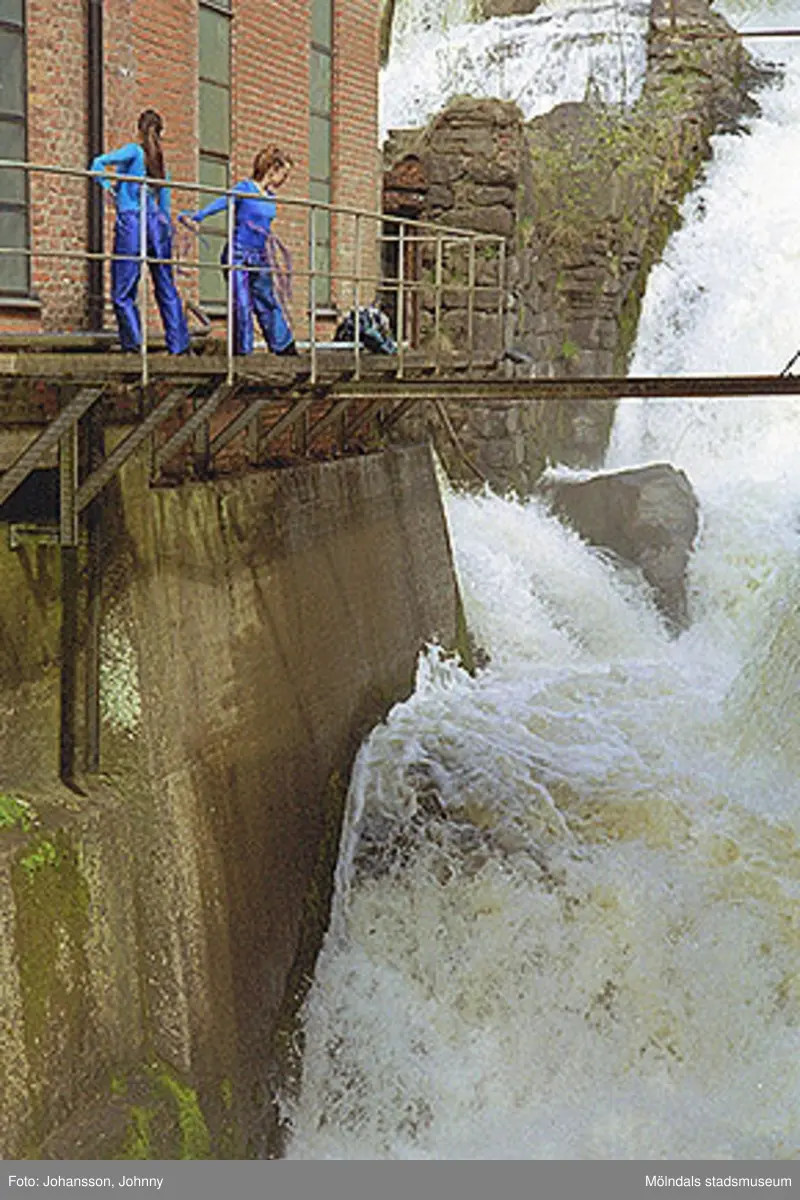 Kvarnbydagen 28 april 2002. Danstillställningen ForsAnde med Tina Andersson och Åsa Thegerström vid Oljeslageriet. Mölndalsfallen rinner till höger.