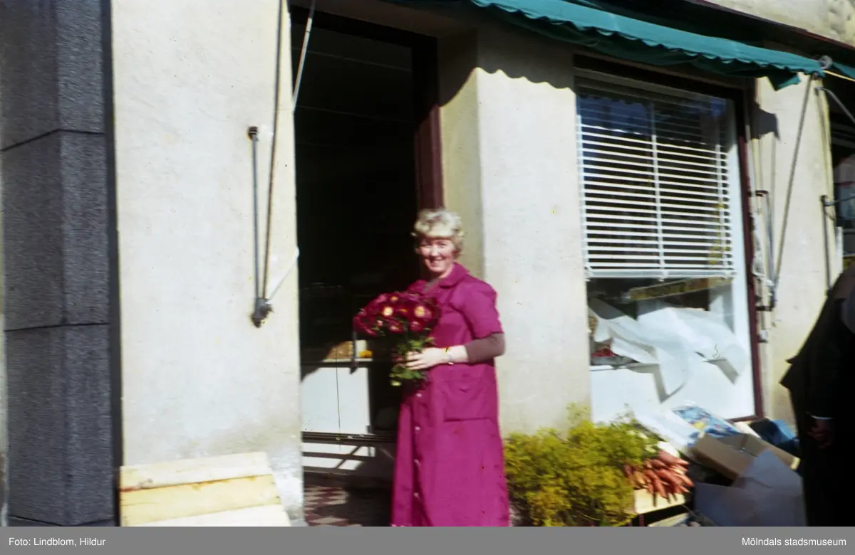 En kvinna står i dörren till något som skulle kunna vara en grönsaksaffär. Möjligen är adressen Kvarnbygatan 43 vid Gamla Torget i Mölndal, 1960-1970-tal.