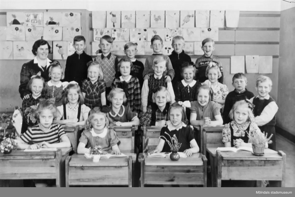 Fröken R. Sylvén med 1:a klass-elever på Centralskolan 1943-44. Flickor sittandes i bänkar. Flickor och pojkar ståendes bakom. Teckningar på väggen. Med på bild finns, sittandes till höger, Berit Gustafsson (född Larsson 1936).