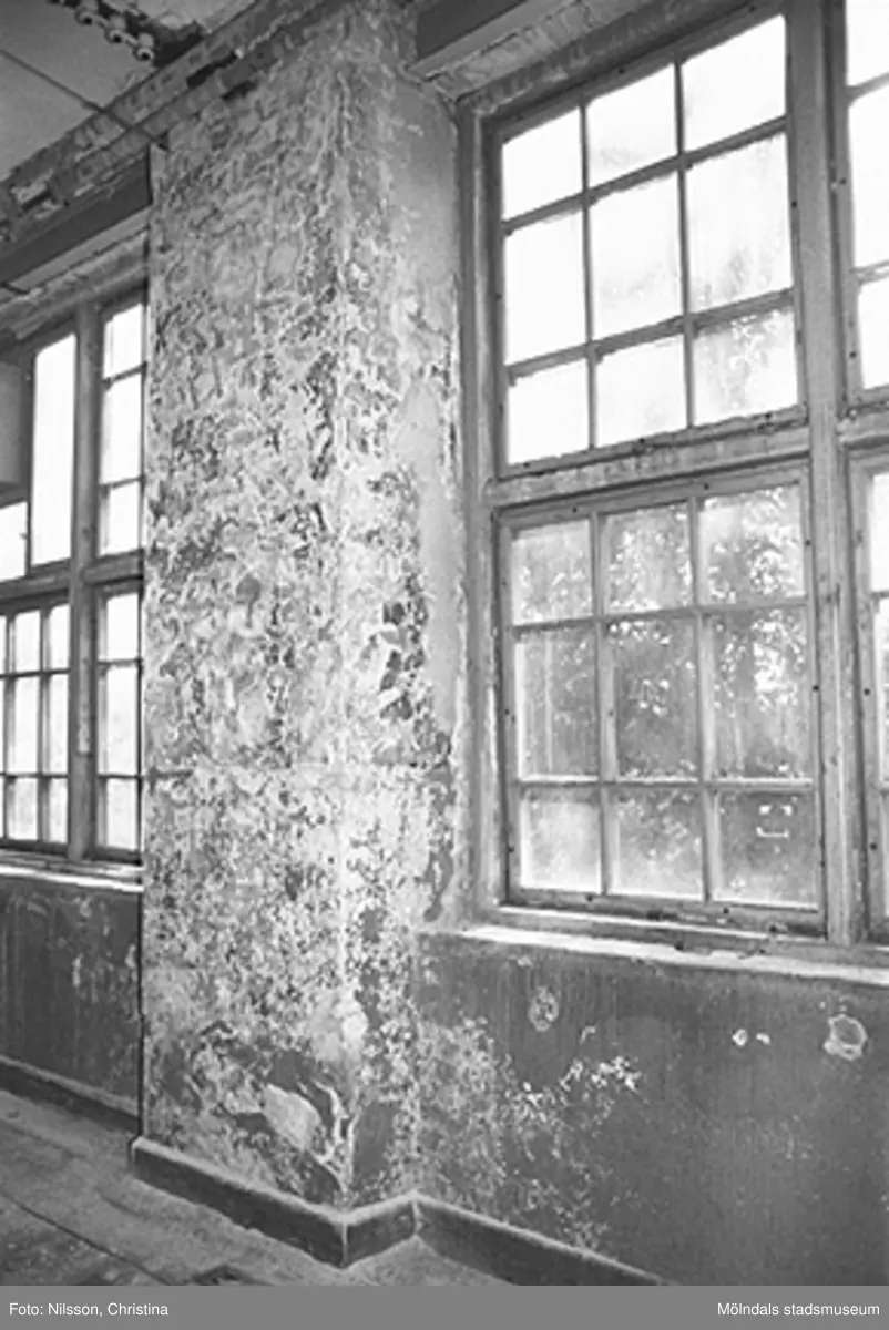Byggnadsdetaljer: Skadad innervägg och två fönster i August Werners fabriker i Lindome. Hösten 1994.