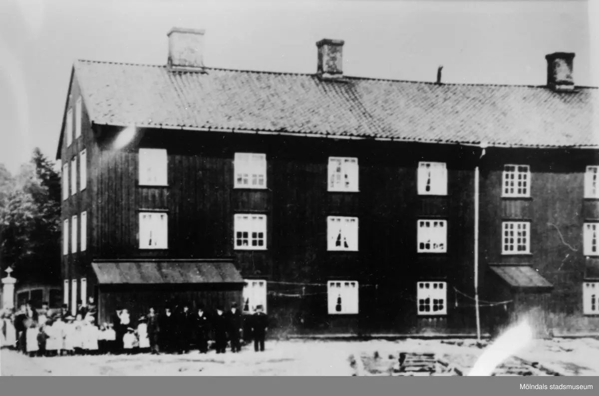 "Böggninga", gamla fabrikens arbetarbostäder, och en grupp boende som står uppställda framför.