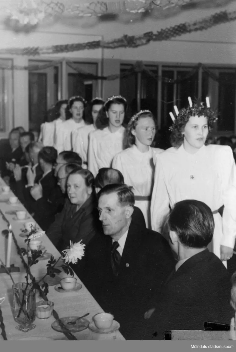 Luciafest vid August Werner 1948. Lucia med tärnor uppvaktar.