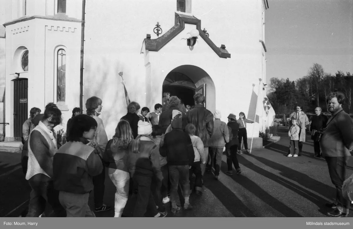 Annestorpsdalens scoutkår på väg in i Lindome kyrka den 23 april 1984.