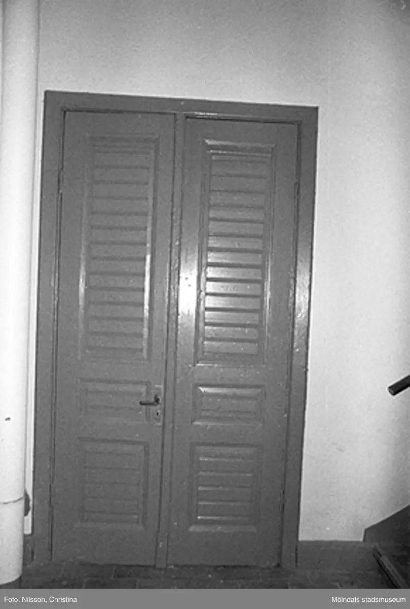 Byggnadsdetaljer: En dubbeldedörr vid en trappa i August Werners fabriker i Lindome. Hösten 1994.