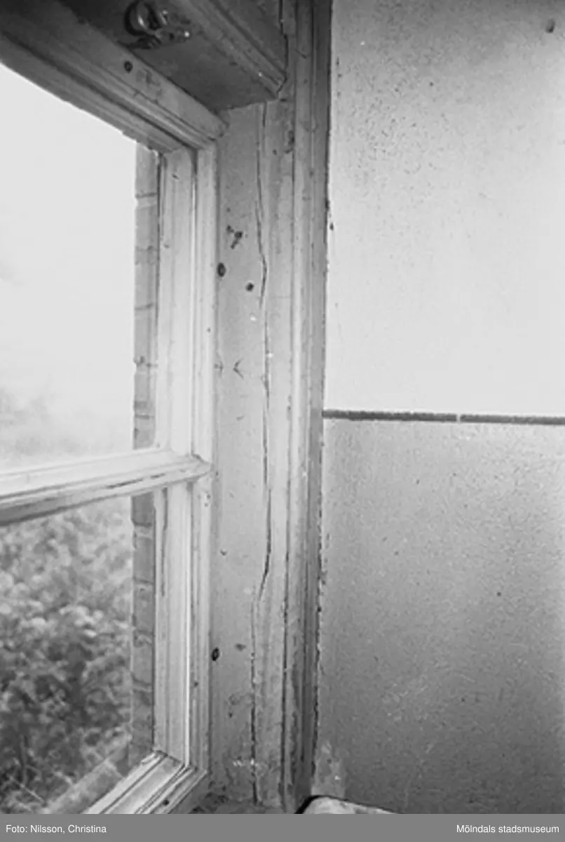 August Werners fabriker i Lindome, hösten 1994. Byggnadsdetalj: del av fönster, karm och vägg.