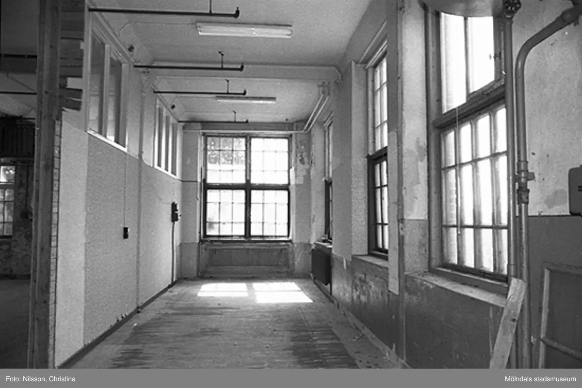 Byggnadsdetaljer: Korridor och fönster i August Werners fabriker i Lindome, hösten 1994.