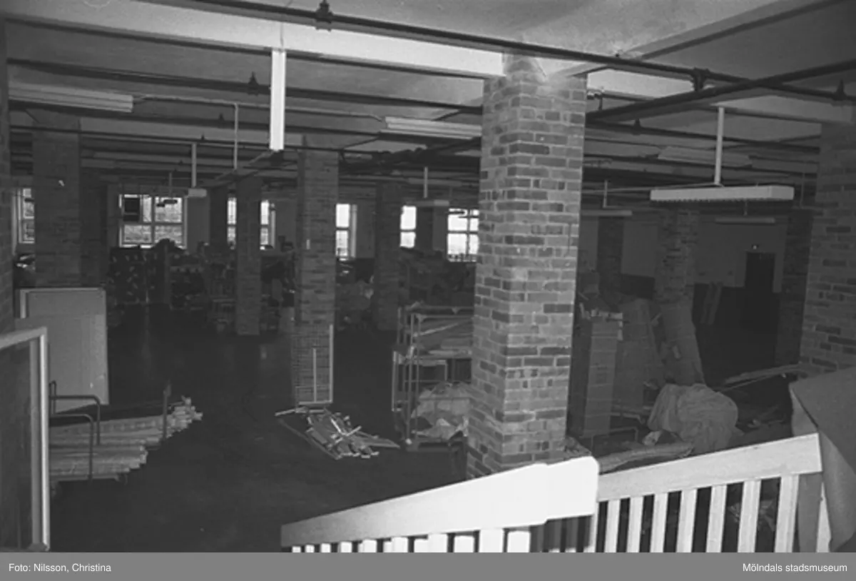 Sal med kvarlämnade saker och tegelpelare i August Werners fabriker i Lindome. Hösten 1994.