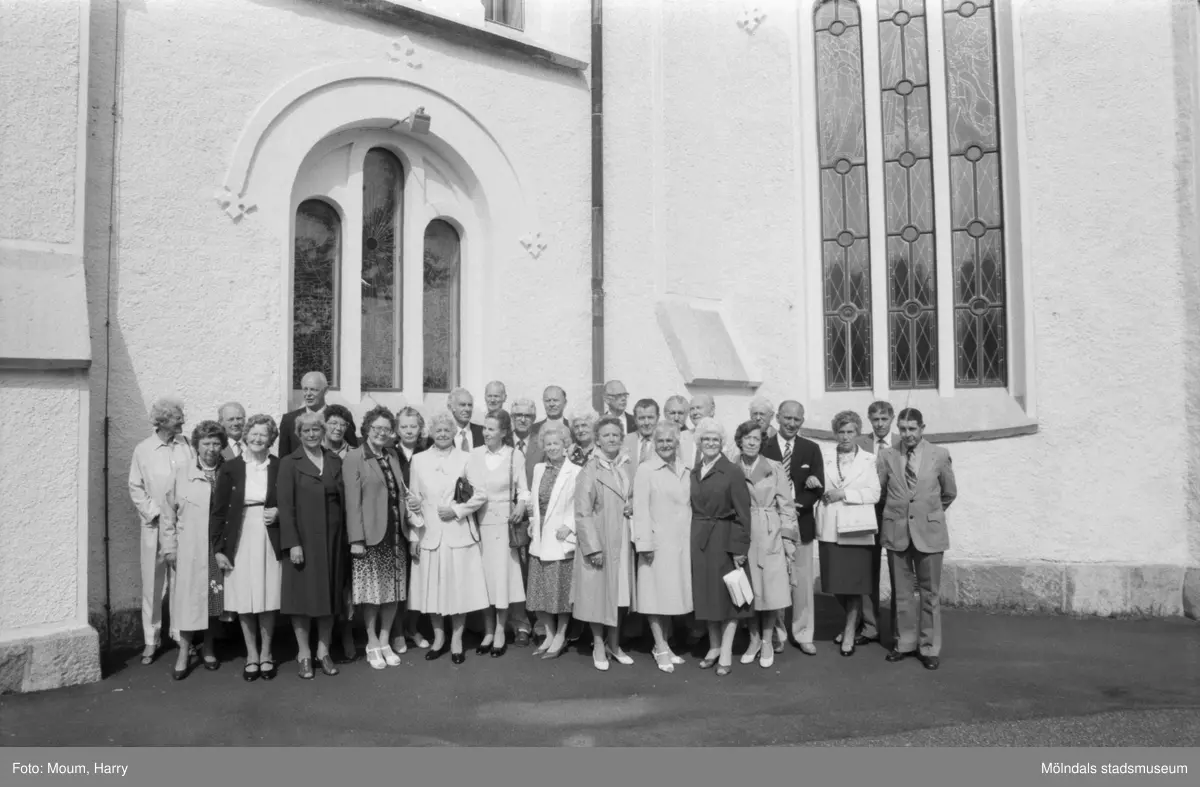 Konfirmander 50-årsjubilerar vid Lindome kyrka, år 1984. "Vid 50-årsjubileet deltog 32 av 1934 års konfirmander, som gjorde återbesök i Lindome kyrka."