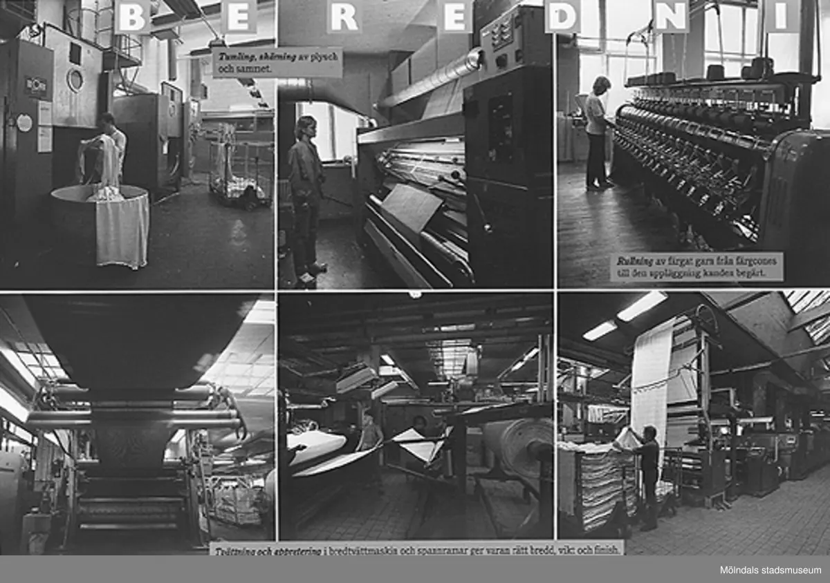 Interiör i Anderstorps fabrik. Bildmontage med förklarande text: Tillskärning, Rullning och Appretering.