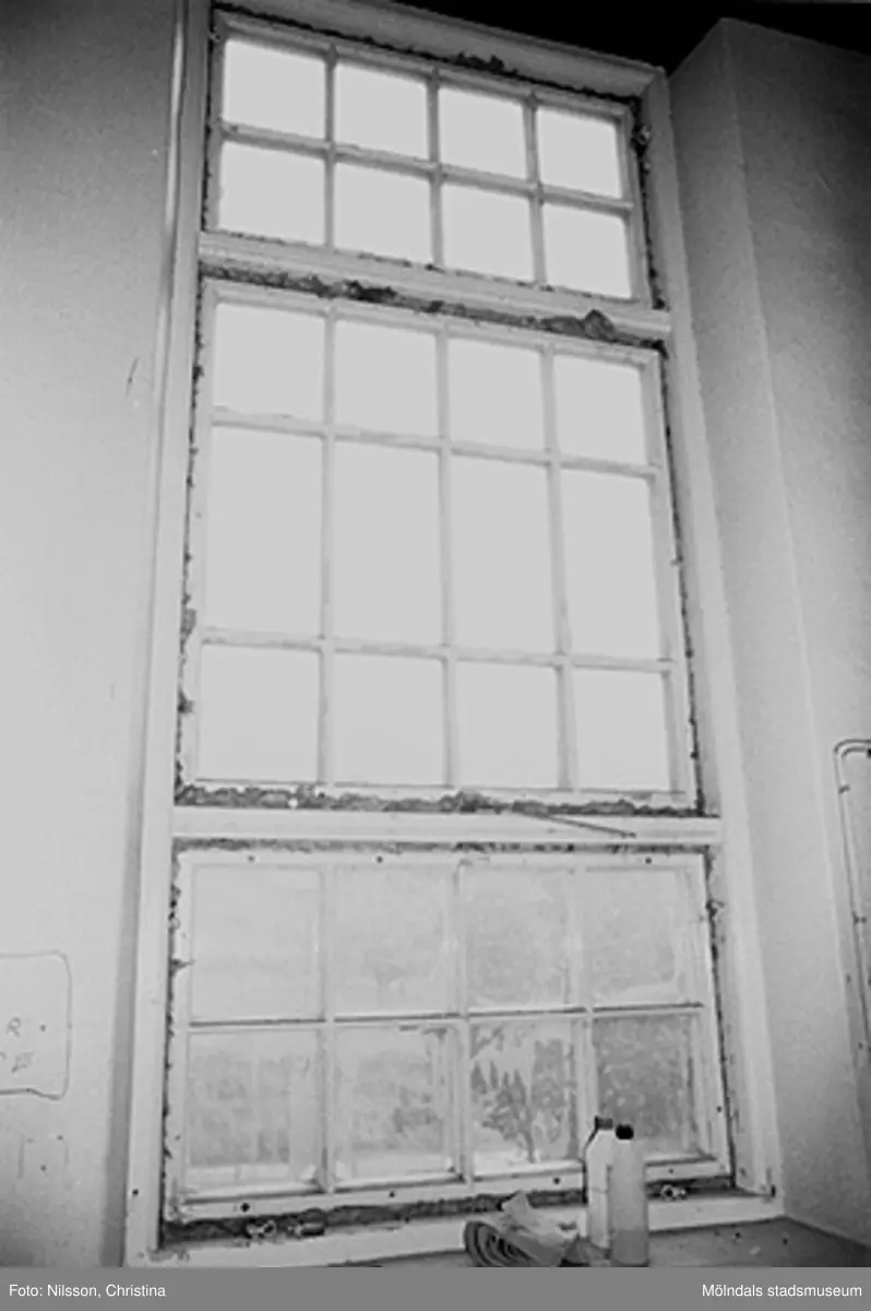 Byggnadsdetaljer: Ett spröjsat fönster i August Werners fabriker i Lindome, hösten 1994.