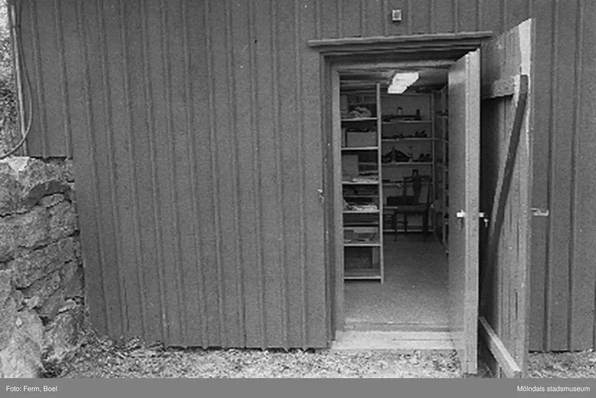 Entré till det slutna magasinet, vilket används som arkiv. Hembygdsgården/Börjesgården i Hällesåker, Lindome 1992-06-29.