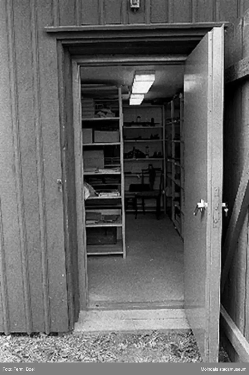 Entré till det slutna magasinet, vilket används som arkiv. Hembygdsgården/Börjesgården i Hällesåker, Lindome 1992-06-29.