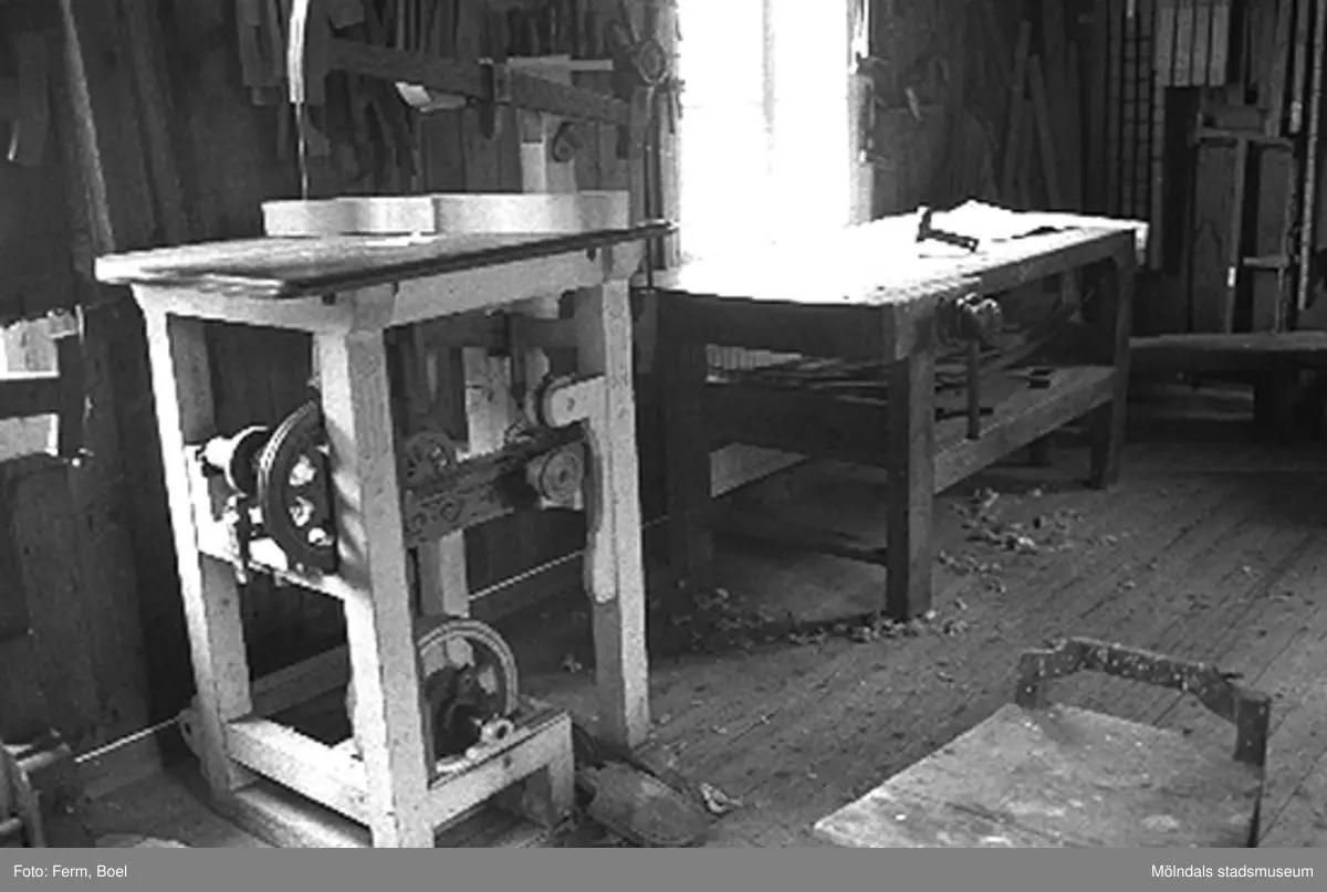 Figursåg och hyvelbänk i snickarboden. Hembygdsgården/Börjesgården i Hällesåker, Lindome 1992-06-29.