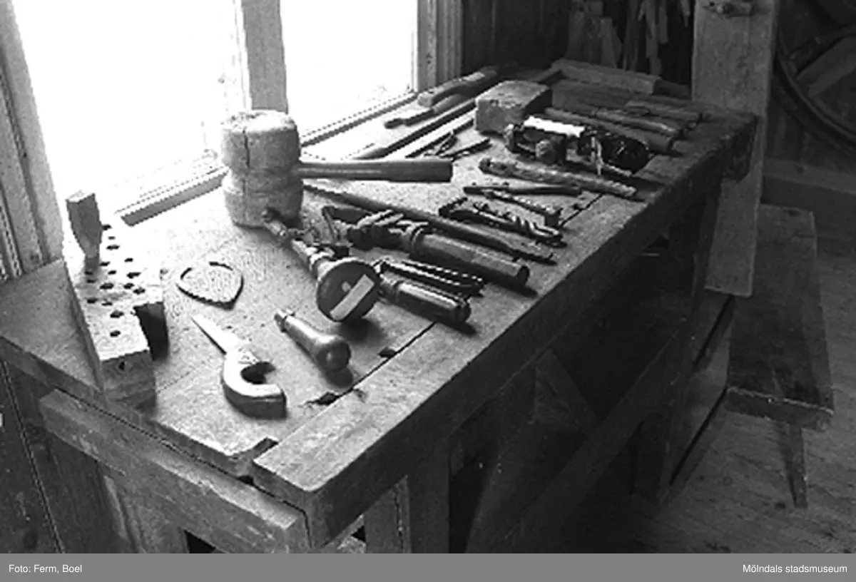 Hyvelbänk med olika redskap och verktyg i snickarboden. Hembygdsgården/Börjesgården i Hällesåker, Lindome 1992-06-29.