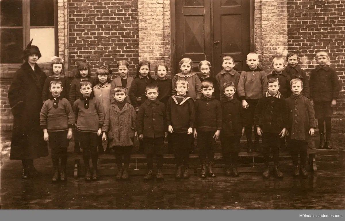 Lärarinnan Agda Carlson med småskoleklass vid Grevedämmets skola i Mölndal på 1920-talet.