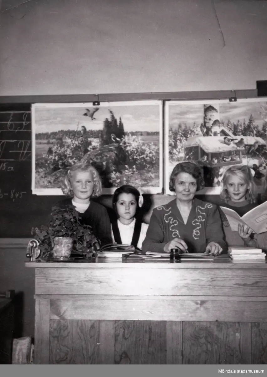 Lärarinnan Agda Carlson tillsammans med skolbarn vid katedern i Grevedämmets skola i Mölndal, ca 1950.