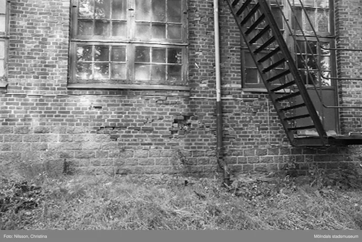 Werners fabriker i Annestorp, Lindome, hösten 1994. Byggnadsdetaljer: Fönster, brandtrappa och stuprör.