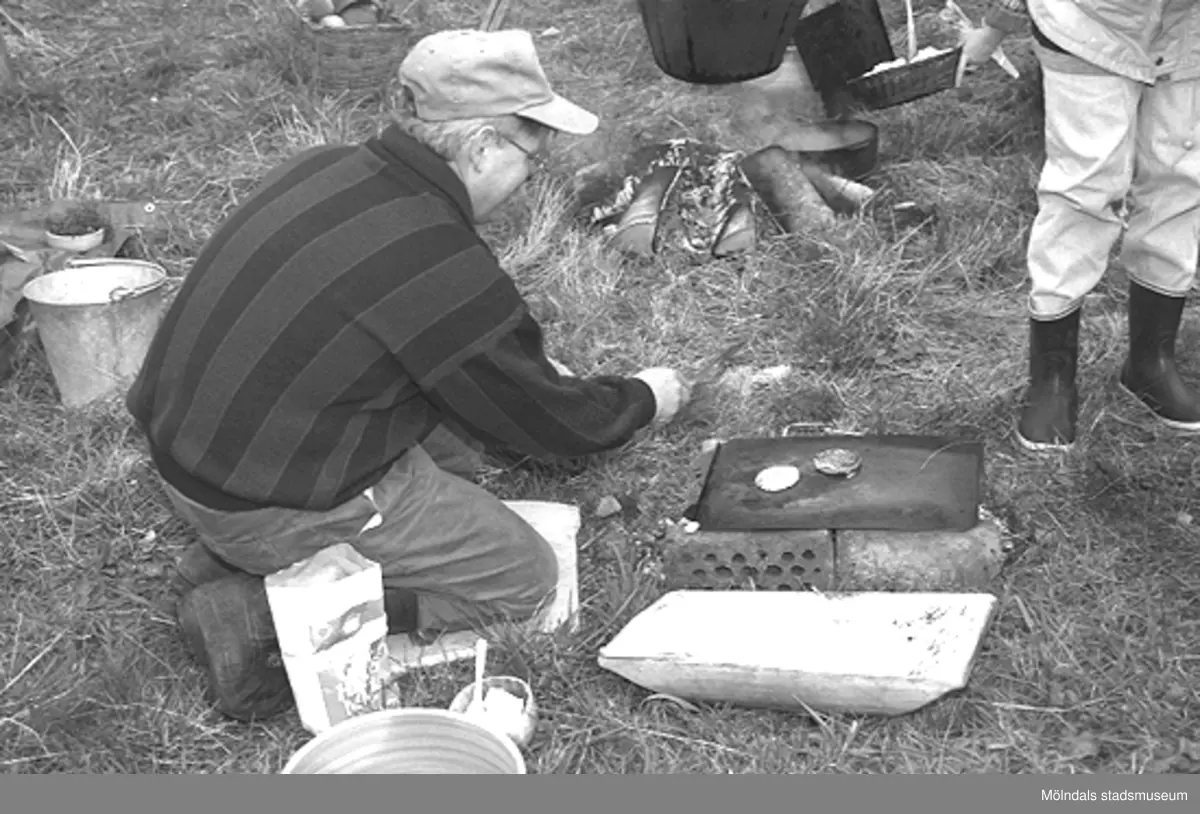 Familjesöndag vid Börjesgården, 1994-05-15. Museitekniker Alf Garthman steker mat på egengjord grill av stenar, tegel och ugnsplåt.