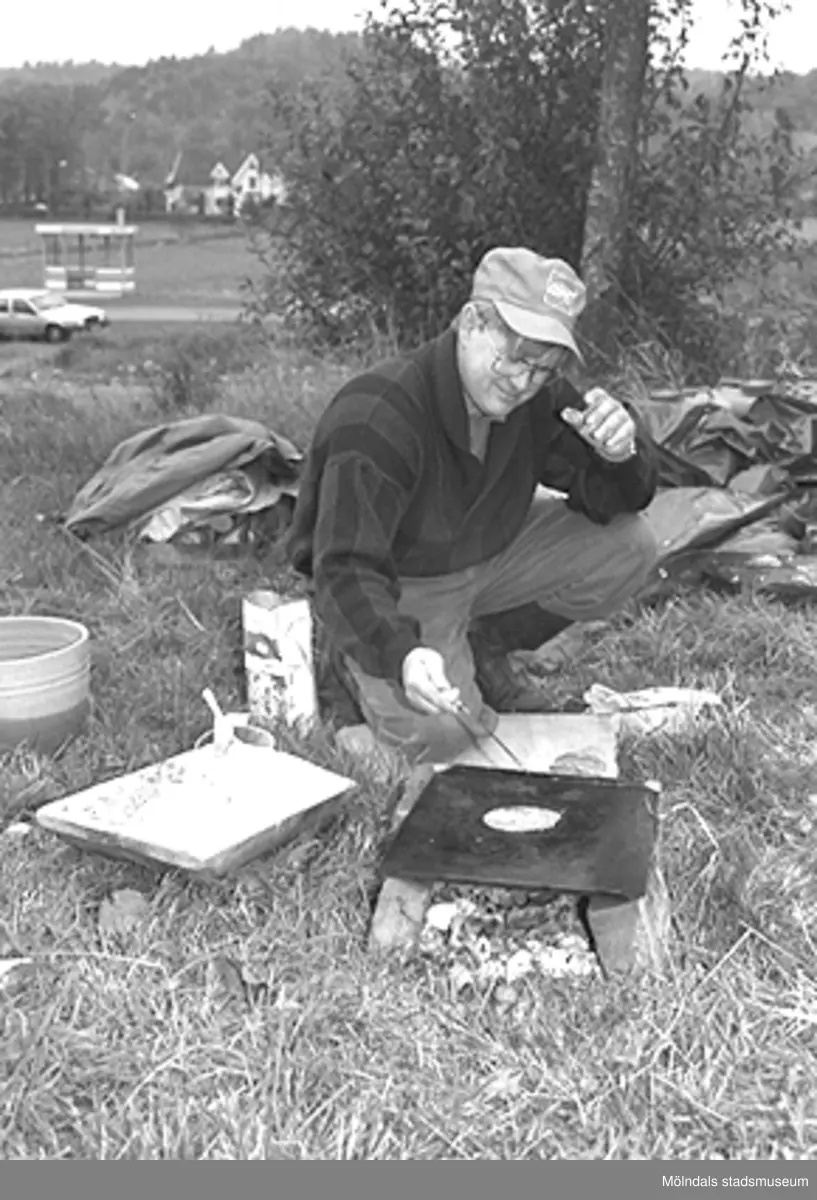 Familjesöndag vid Börjesgården, 1994-05-15. Museitekniker Alf Garthman grillar mat på en egengjord grill.
