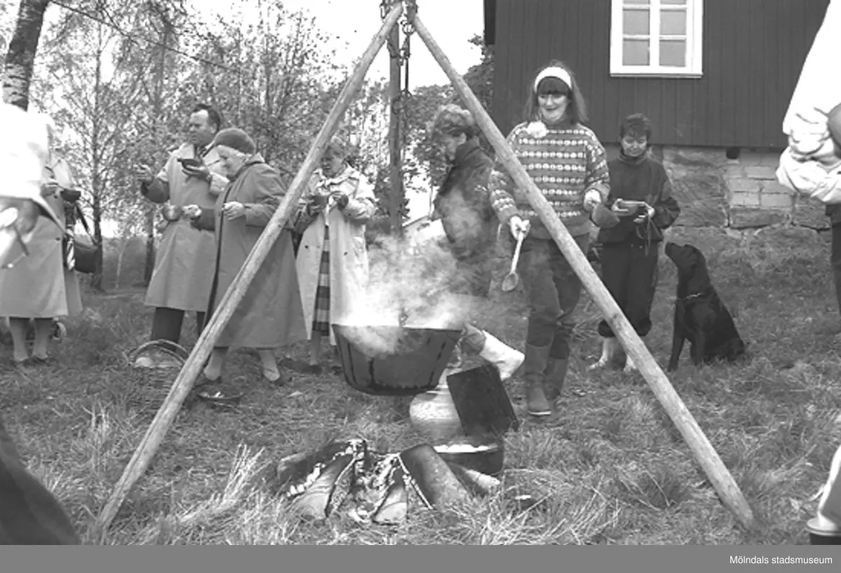 Familjesöndag vid Börjesgården, 1994-05-15. Museichef Mari-Louise Olsson kokar mat över öppen eld.