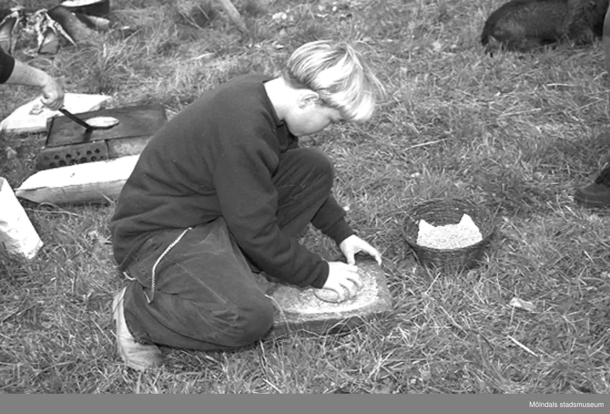 Familjesöndag vid Börjesgården, 1994-05-15. En grabb maler korn mellan två stenar för att det ska bli mjöl.