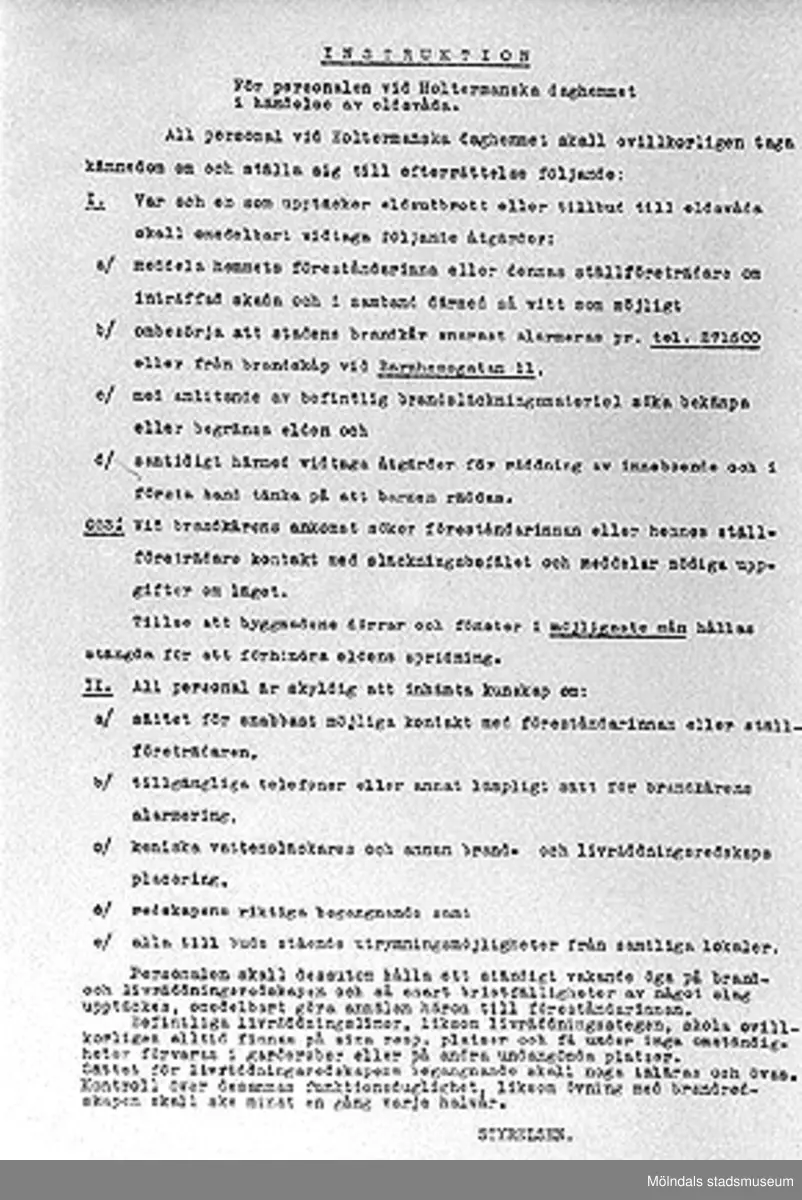 Ark med instruktioner till personalen vid Holtermanska daghemmet, 1940-tal.